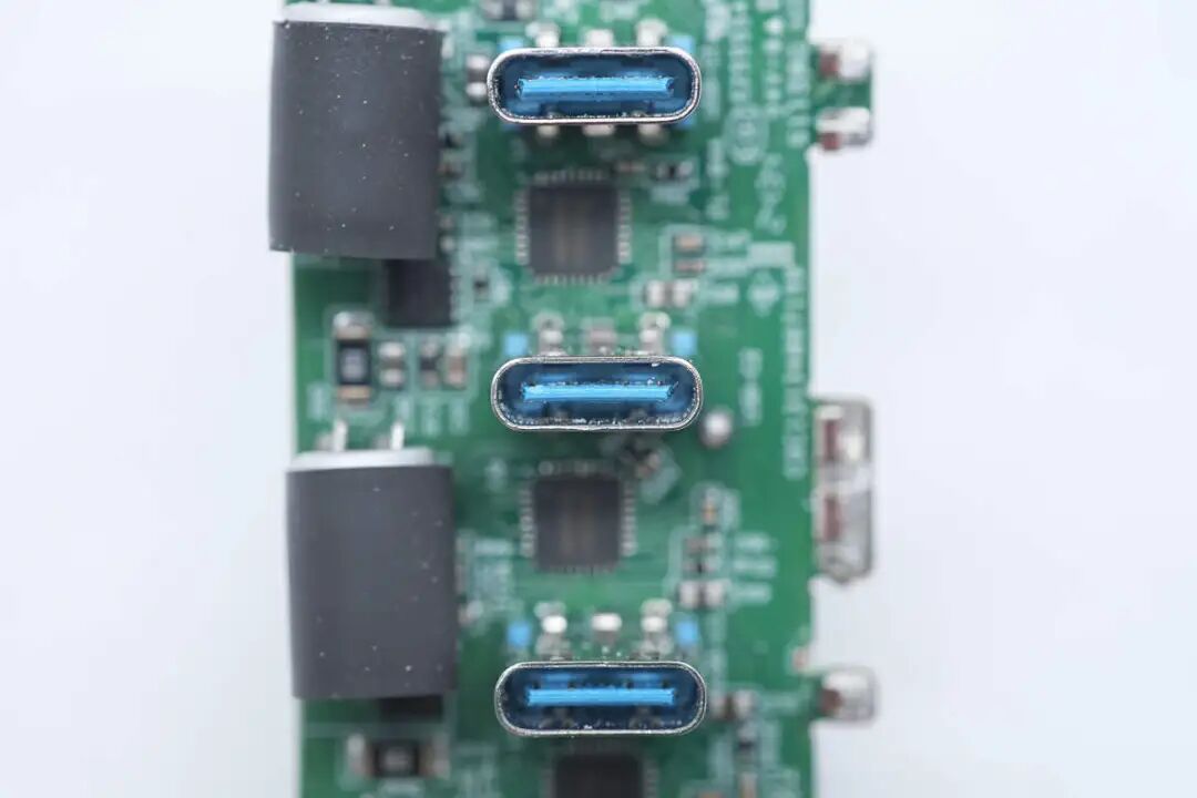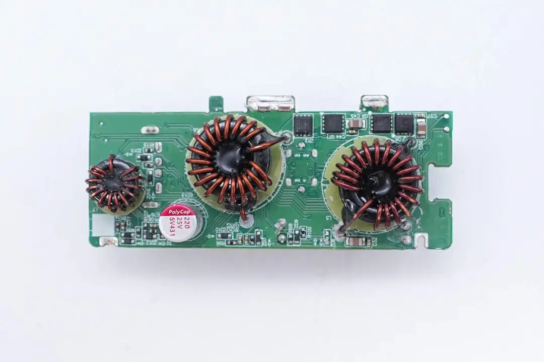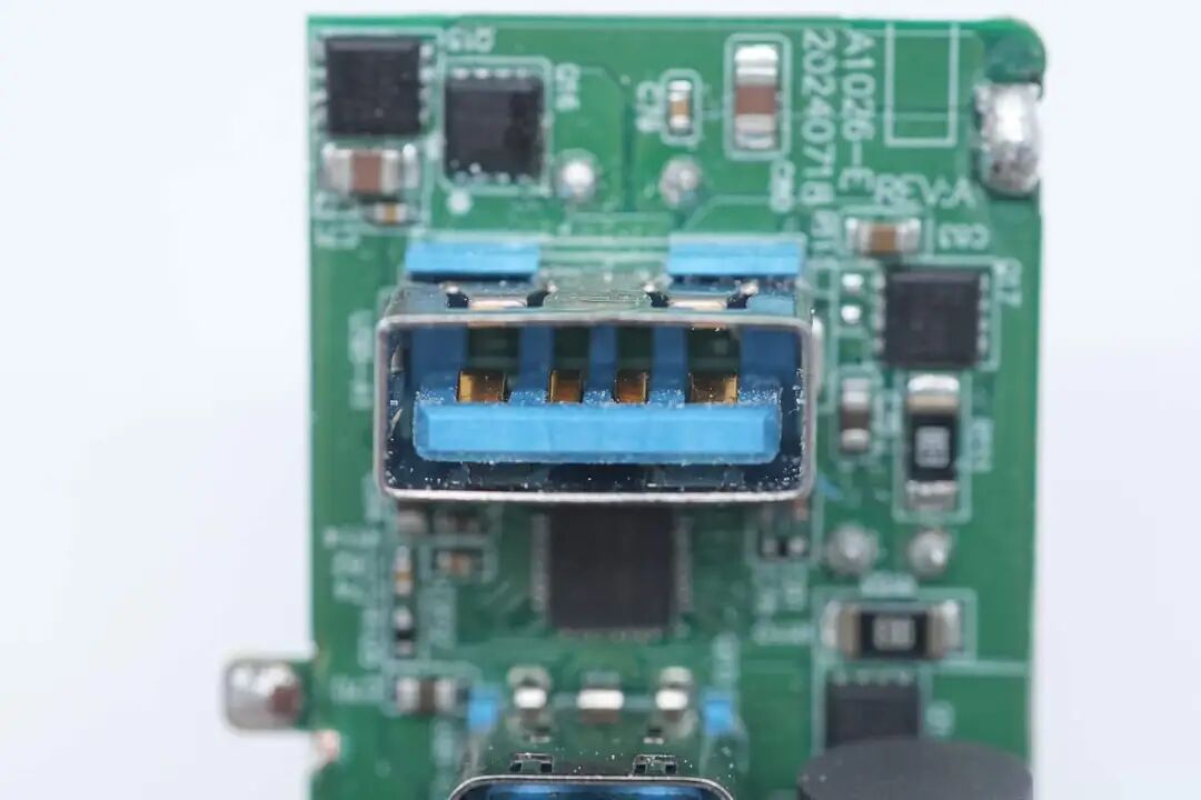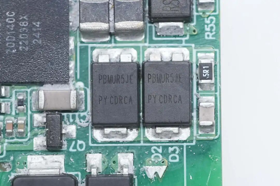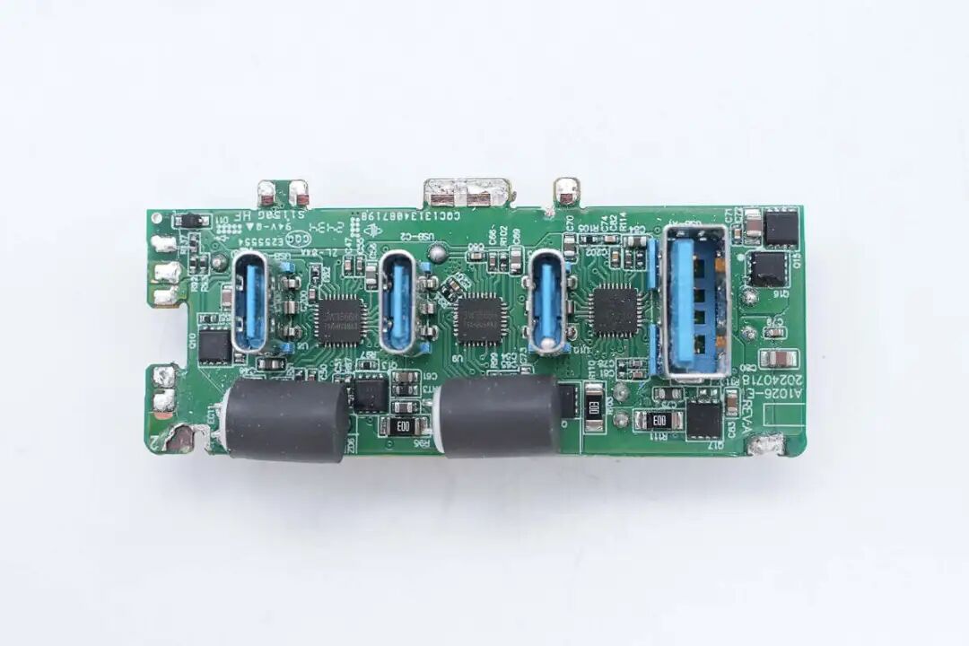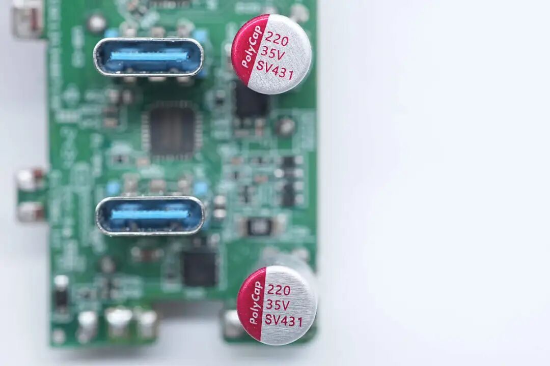 輸出端小板正面設(shè)有輸出濾波固態(tài)電容、降壓協(xié)議芯片、同步降壓開關(guān)管、輸出VBUS開關(guān)管以及USB母座,兩顆固態(tài)濾波電容外套膠套保護(hù)。