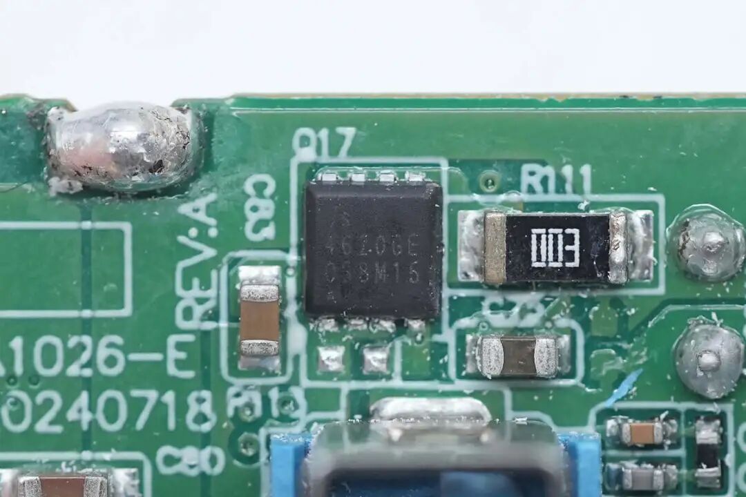 小板背面設(shè)有氮化鎵半橋芯片、貼片Y電容、光耦、同步整流控制器以及同步整流管。