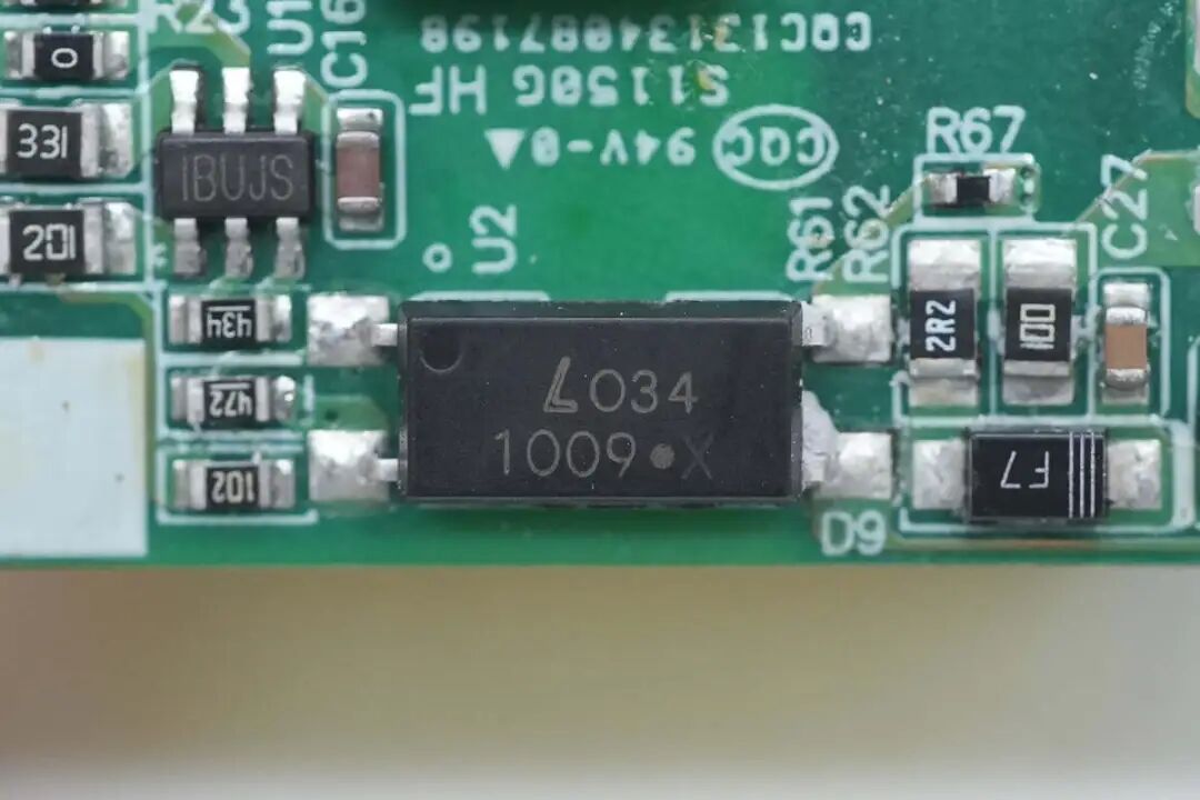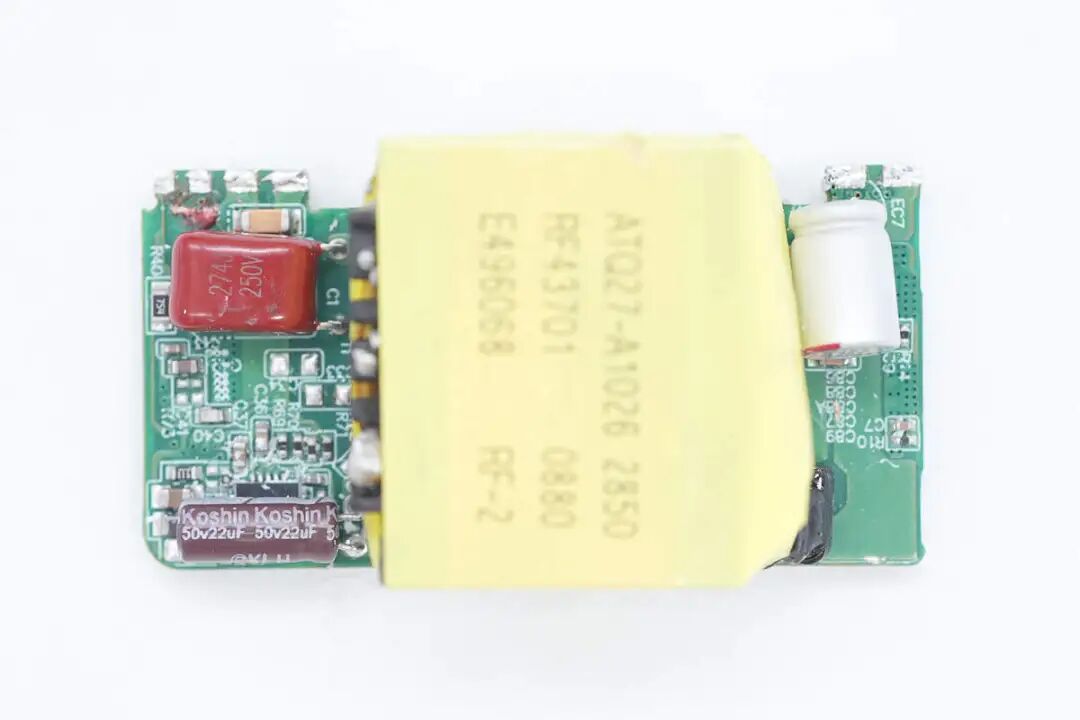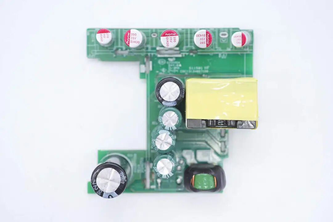 變壓器小板正面兩側(cè)設(shè)有諧振電容、主控芯片供電電容、開關(guān)電源主控芯片以及固態(tài)濾波電容。