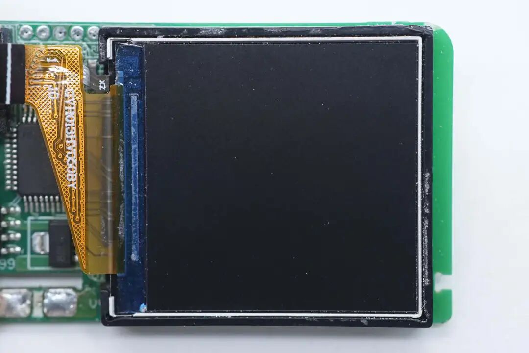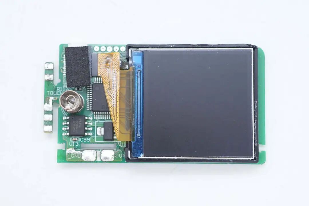 顯示屏通過排線連接側(cè)邊PCB板,板子左側(cè)區(qū)域還設(shè)有MCU、存儲器等器件。