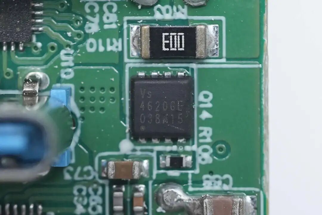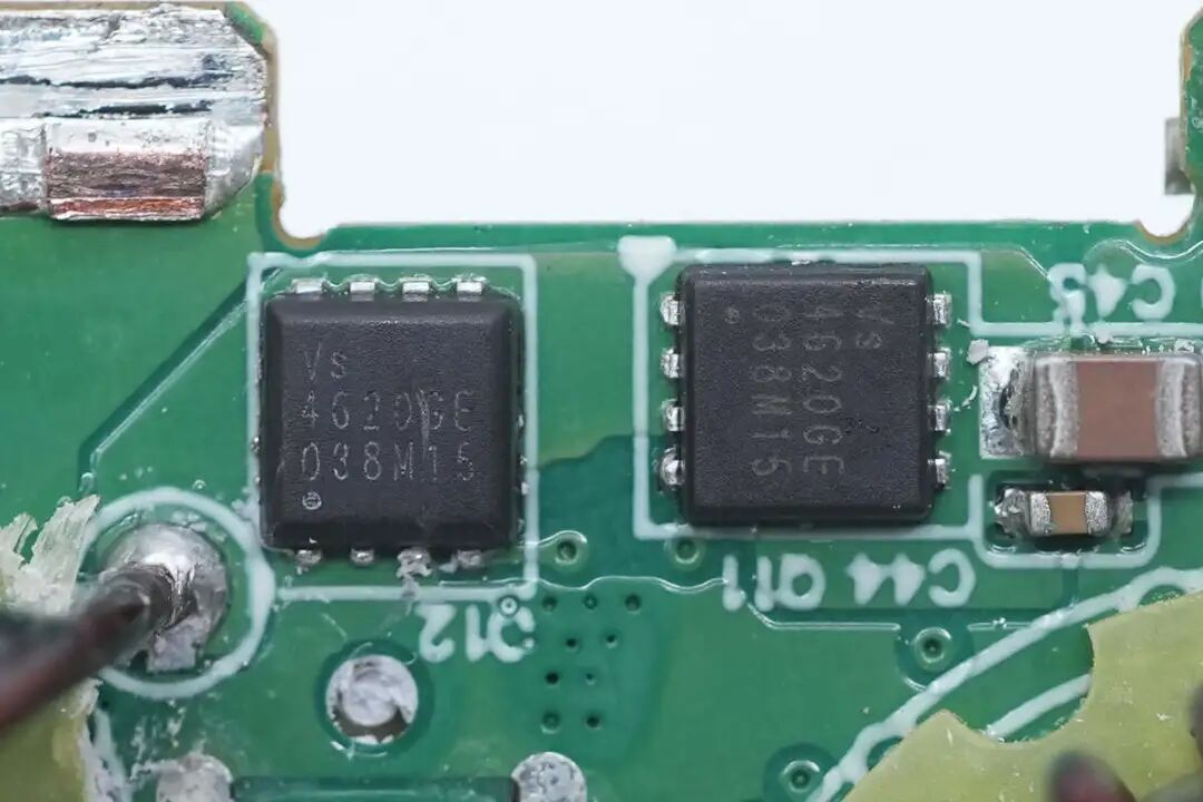 對應(yīng)兩顆同步降壓開關(guān)管來自威兆半導(dǎo)體,型號VS4620GEMC,NMOS,耐壓40V,導(dǎo)阻6.4mΩ,采用PDFN3333封裝,使用四顆用于兩路電源并聯(lián)控制。