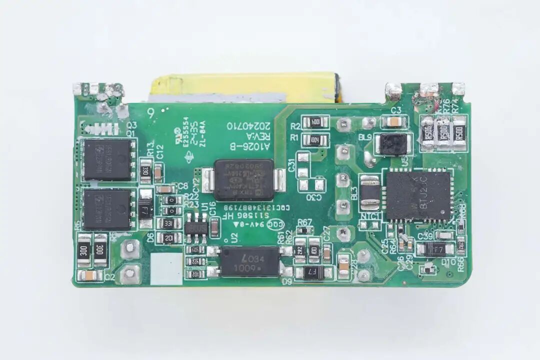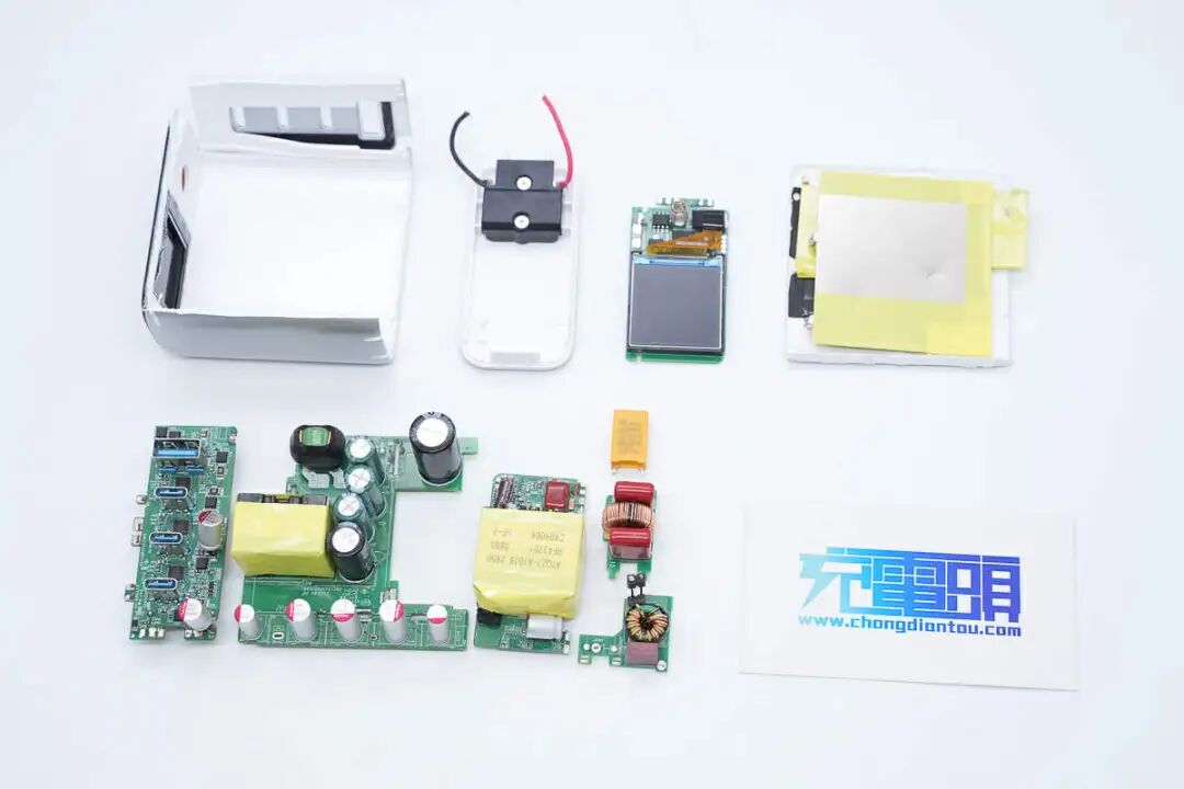 輸出使用三顆智融科技SW3566H進(jìn)行二次降壓和控制四口輸出,使用了10顆威兆半導(dǎo)體VS4620GEMC進(jìn)行同步整流降壓和作為輸出VBUS開關(guān)管。東佳和柏瑞凱品牌電容進(jìn)行散熱輸出濾波。PCBA模塊由多塊小板組成,器件間填充導(dǎo)熱膠以及覆蓋導(dǎo)熱墊和散熱片,產(chǎn)品由奧??萍即ぃ龉び昧显鷮嵖煽?。