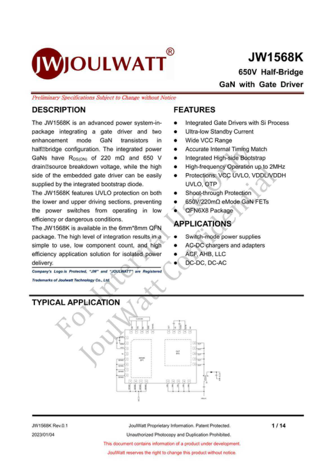 氮化鎵半橋芯片采用杰華特JW1568K,芯片集成了一個門極驅(qū)動器和兩個增強(qiáng)模式的GaN晶體管,使其在設(shè)計上更加簡化,可大大降低系統(tǒng)復(fù)雜度。集成的功率GaN器件具有220mΩ的導(dǎo)通電阻和650V耐壓。