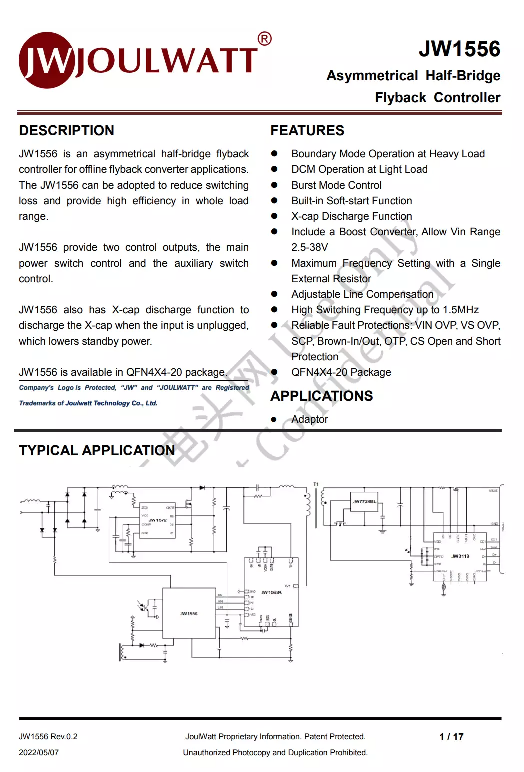 AHB控制器來自杰華特,型號JW1556,是一款非對稱半橋反激式控制器,采用QFN4x4-20封裝,適用于離線反激式轉(zhuǎn)換器應(yīng)用。芯片內(nèi)部集成供電升壓轉(zhuǎn)換器,輸入電壓范圍 2.5-38V,最高工作頻率達(dá)1.5MHz,支持65-300W快充應(yīng)用。