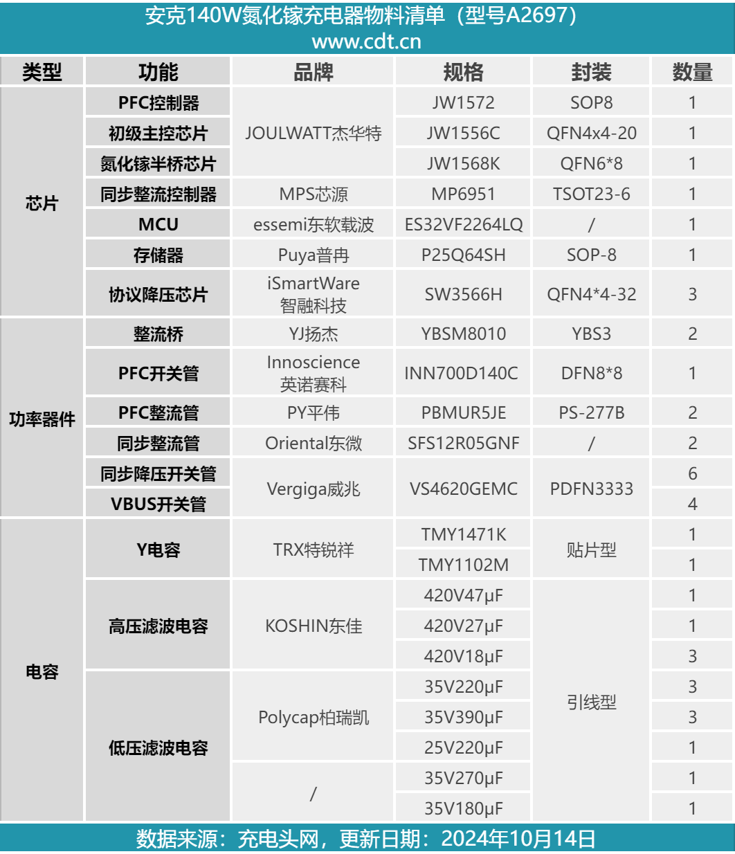 最后附上安克140W氮化鎵充電器的核心器件清單,方便大家查閱。